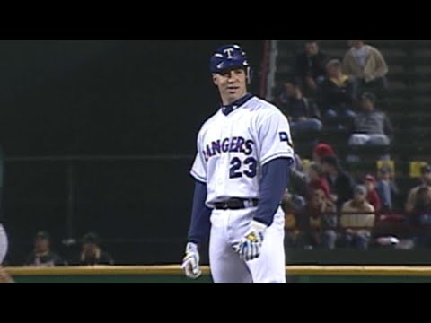 4/9/03: Rangers rookie Mark Teixeira doubles for his first hit in the Majors